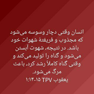 یعقوب باب 1 ایه 13 تا 166كسیكه گرفتار وسوسه میشود، نباید بگوید: «خداوند مرا به وسوسه انداخته است.» چون خداوند از بدی مبرّاست و كسی را به وسوسه نمیاندازد. انسان وقتی دچار وسوسه میشود كه مجذوب و فریفتهٔ شهوات خود باشد. در نتیجه، شهوت آبستن میشود و گناه را تولید میکند و وقتی گناه کاملاً رشد كرد، باعث مرگ میشود.