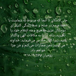 و باز در این باره در کلام ؛ رومیان ۱۲ ایه ۱۸ و ۱۹ داریم :حتّیالامكان تا آنجا كه مربوط به شماست با همهٔ مردم در صلح و صفا زندگی كنید. ای دوستان عزیز، به هیچ وجه انتقام خود را نگیرید، بلكه آن را به مكافات الهی واگذار كنید، زیرا در کتابمقدس خداوند می گوید: «من مجازات میکنم و من جزا خواهم داد. اگر امکان دارد